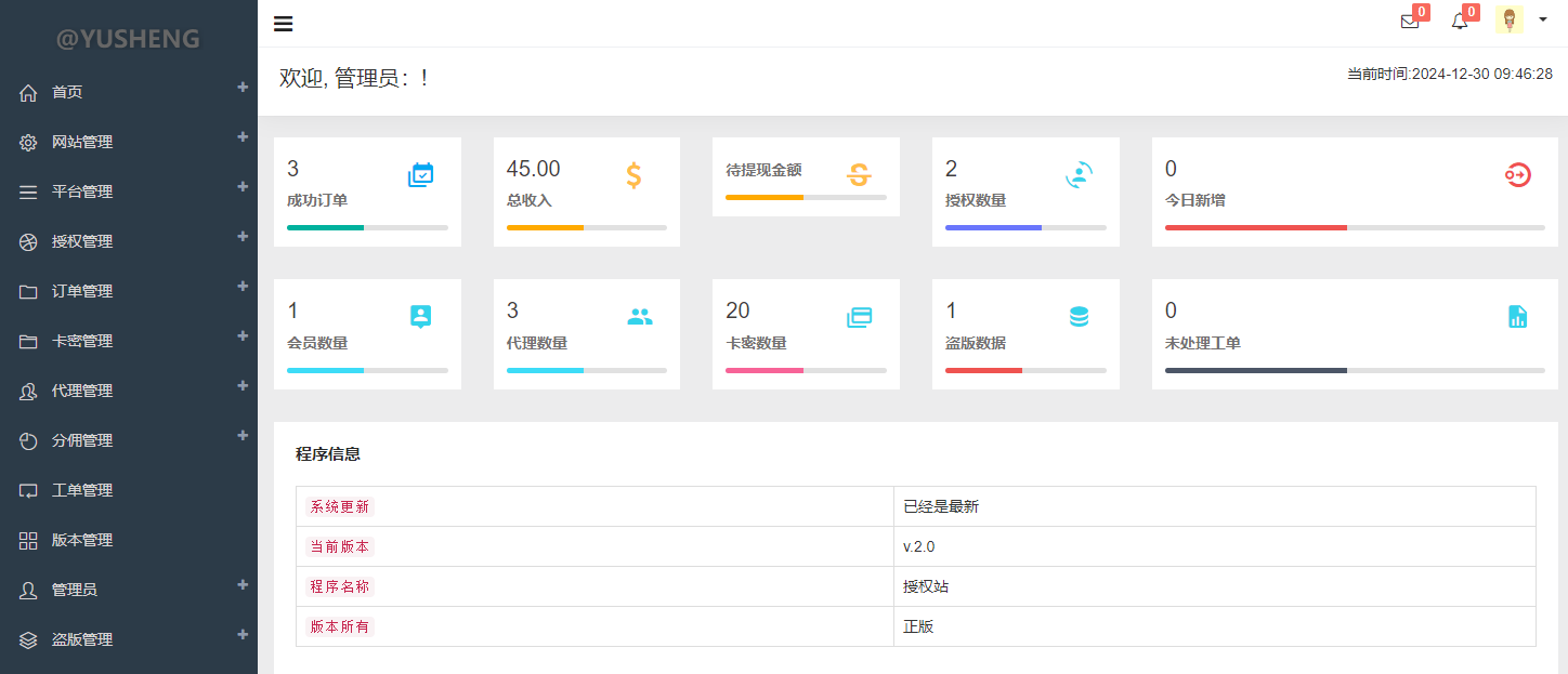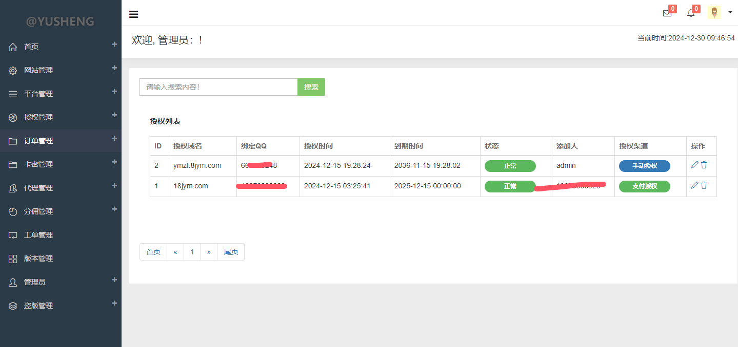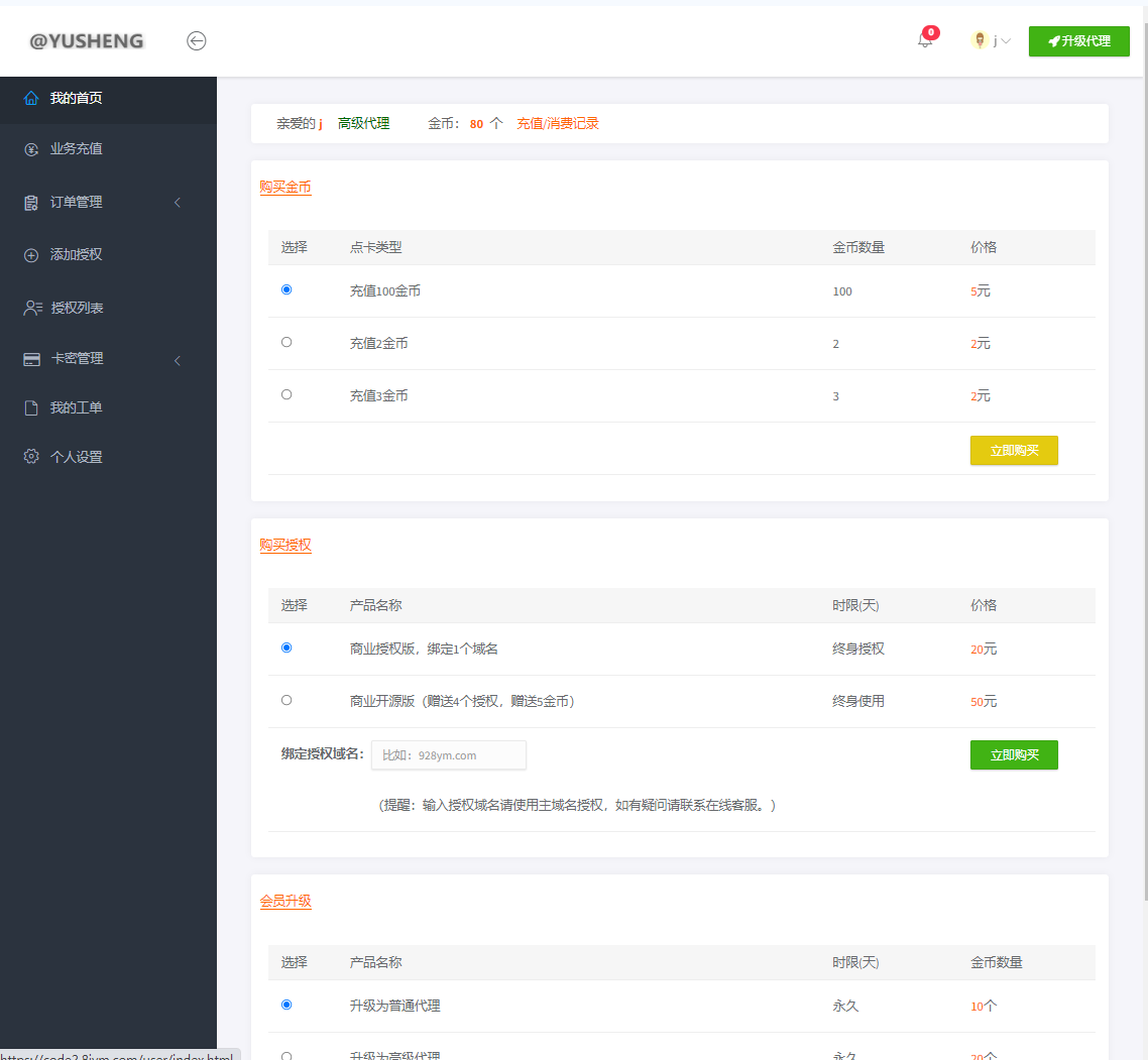 (3)高级代理【业务充值、充值记录、授权记录、消费记录、添加授权、授权列表、生成卡密、卡密列表、卡密使用记录、我的工单、个人设置】